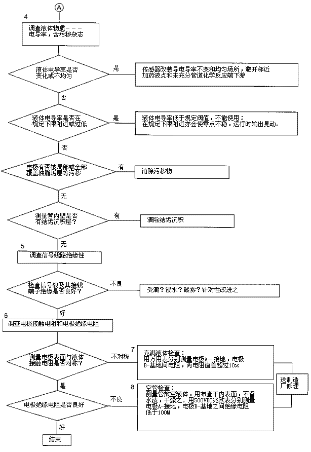 圖5所示足檢查零點(diǎn)污水流量計不穩(wěn)定的流程。先按流程全面考慮作初步調(diào)查和判斷,然后再逐項(xiàng)細(xì)致檢查和試排除故障。流程所列檢查項(xiàng)口順序的先后原則是:
