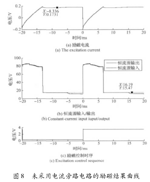 實驗結(jié)果表明,高壓源向低壓源切換后,三端穩(wěn)壓器的工作特性致使的電流波動和低壓源供電情況下的恒流控制,會大幅延長勵磁電流的穩(wěn)態(tài)響應時間。圖8所示勵磁電流約在17ms左右進入穩(wěn)態(tài),圖9所示勵磁電流的穩(wěn)態(tài)響應時間約為12ms。這表明,在采用三端穩(wěn)壓器搭建恒流控制電路的情況下,電流旁路電路能有效克服三端穩(wěn)壓器工作特性的影響,并能方便的實現(xiàn)電流超調(diào),加快勵磁電流的響應速度。