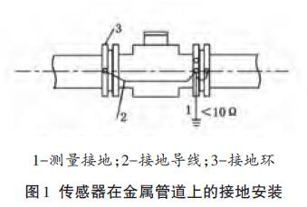 傳感器安裝在塑料管道或內(nèi)壁有絕緣涂層、襯里的管道上,兩端應(yīng)安裝接地環(huán)(或帶有接地電*的金屬短管),然后用導(dǎo)線連接,使管內(nèi)流動(dòng)的介質(zhì)與大地短路,具有零電位(見圖2)。