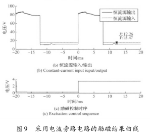實驗結(jié)果表明,高壓源向低壓源切換后,三端穩(wěn)壓器的工作特性致使的電流波動和低壓源供電情況下的恒流控制,會大幅延長勵磁電流的穩(wěn)態(tài)響應(yīng)時間。圖8所示勵磁電流約在17ms左右進(jìn)入穩(wěn)態(tài),圖9所示勵磁電流的穩(wěn)態(tài)響應(yīng)時間約為12ms。這表明,在采用三端穩(wěn)壓器搭建恒流控制電路的情況下,電流旁路電路能有效克服三端穩(wěn)壓器工作特性的影響,并能方便的實現(xiàn)電流超調(diào),加快勵磁電流的響應(yīng)速度。