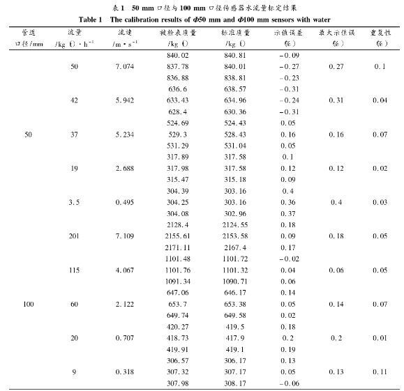 為了評測系統(tǒng)的實際應(yīng)用效果,進(jìn)行了水流量標(biāo)定實驗。分別針對50mm口徑與100mm口徑的傳感器進(jìn)行標(biāo)定。系統(tǒng)勵磁方式采用方波勵磁,勵磁頻率為12.5Hz,管道*大流速為7m/s左右,*小流速為0.3 m/s左右,標(biāo)定結(jié)果如表1所示。