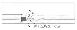 來自上游的水體經(jīng)浮體結(jié)構(gòu)的阻擋作用,水流繞流經(jīng)浮體結(jié)構(gòu)的上部和下部區(qū)域通過,并在浮體結(jié)構(gòu)背水面的下游區(qū)域形成小范圍回流區(qū),此處水流紊亂,流速分布不均勻。試驗過程中,對回流區(qū)沿水流方向的長度D(水槽縱向中心斷面處,自浮體結(jié)構(gòu)背水面到沿水流方向流速為0的*遠(yuǎn)位置點)進行量測。選取浮體結(jié)構(gòu)下游區(qū)域回流區(qū)中心點所在斷面進行流速測量對比。流速測量斷面位置A-A見圖3。