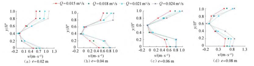 圖4橫坐標(biāo)為斷面水流方向流速,縱坐標(biāo)為測點垂向位置與下游水位的比值y/H'。隨著浮體結(jié)構(gòu)位置的上升,*小斷面流速位置同樣上升。以圖3(a)為例,當(dāng)e=0.02m時,下游斷面位置自下而上呈現(xiàn)先減小、后增大的趨勢,在y/H'=0.40時流速達(dá)到*小,隨著浮體結(jié)構(gòu)位置的上升,*小流速呈現(xiàn)向上偏移的趨勢。在斷面位置y/H'=0.20時,隨著e的增大,流速呈現(xiàn)增大的趨勢。當(dāng)e較小時,流經(jīng)浮體結(jié)構(gòu)下部進行下泄的水流較少,主流出現(xiàn)在浮體結(jié)構(gòu)的上部,且在浮體結(jié)構(gòu)的阻擋作用下出現(xiàn)回流區(qū);隨著e上升,主流偏向浮體結(jié)構(gòu)下部區(qū)域,流速增大。與y/H'=0.20的流速分布正好相反,當(dāng)y/H'=0.80時,流速分布隨著浮體位置的增大而減小。隨著e的增大,通過浮體結(jié)構(gòu)下部泄流的水體增多,主流開始向下偏移。試驗過程中,浮體結(jié)構(gòu)處于淹沒狀態(tài),流速的分布隨著浮體位置的改變呈現(xiàn)上大、中小、下大的分布趨勢,在浮體結(jié)構(gòu)下游區(qū)域形成回流區(qū),回流區(qū)的位置隨著浮體結(jié)構(gòu)的上升而上升。