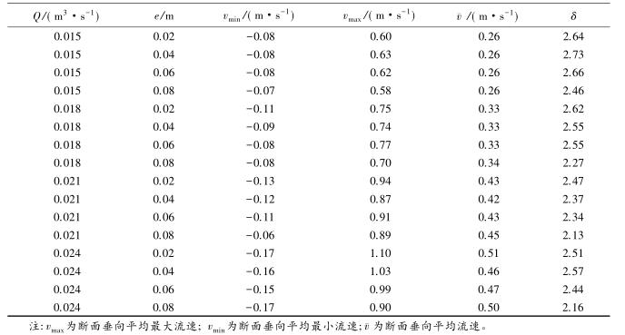 流速沿斷面分布的均勻特性可以通過流速分布不均勻系數(shù)進行表征,通過所選取斷面*大流速和*小流速的差值與該斷面平均流速的比值,δ值越大表明浮體結(jié)構(gòu)的存在對水流斷面流速的分布產(chǎn)生的影響較大。表2中,當(dāng)來流流量相同時,流速的不均勻系數(shù)多數(shù)隨e的增大而減小。浮體結(jié)構(gòu)位置較小時,主流為浮體結(jié)構(gòu)上部的水流。隨著浮體結(jié)構(gòu)位置的上升,來自上游的水體逐漸分成浮體結(jié)構(gòu)上部和下部的兩股主流,流速分布的不均性減小。浮體結(jié)構(gòu)位置及所處水位條件相同時,來流流量的增大,區(qū)域的平均流速增大,因此流速不均勻性減小。