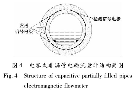 ②電容式非滿管軟化水流量計(jì)h。電容式非滿管軟化水流量計(jì)結(jié)構(gòu)簡圖如圖4所示。、檢測信號(hào)電* 發(fā)送信號(hào)電