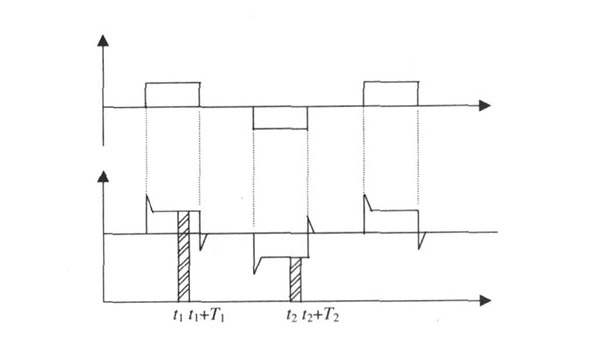 污水管道流量計一般都采用工頻交流電源供電, 其電源電壓的幅值和頻率的變化都會給污水管道流量計帶來電源性干擾噪聲。對電源電壓的幅值變化, 因采用多級集成穩(wěn)壓, 一般而言電源電壓的幅值變化對電磁流量的測量精度影響不大。當(dāng)電源電壓的頻率波動時, 雖然其波動范圍有限, 但對污水管道流量計測量精度影響較大。為了解決工頻干擾問題, 實現(xiàn)對流體流速感應(yīng)電勢eab信號的準(zhǔn)確測量, 需利用以下基本關(guān)系:①勵磁周期為工頻周期的整數(shù)倍, 即勵磁頻率為50/nHz(n為偶數(shù));②正負勵磁下的同相位采樣。圖2是對應(yīng)低頻矩形波勵磁形式下的典型電勢信號形式, 按上述關(guān)系在一個勵磁周期下, 若假設(shè)t1 和t2 點為工頻干擾的等效干擾點, 且采樣寬度T=T1 =T2 , 則eab的基本算式為: