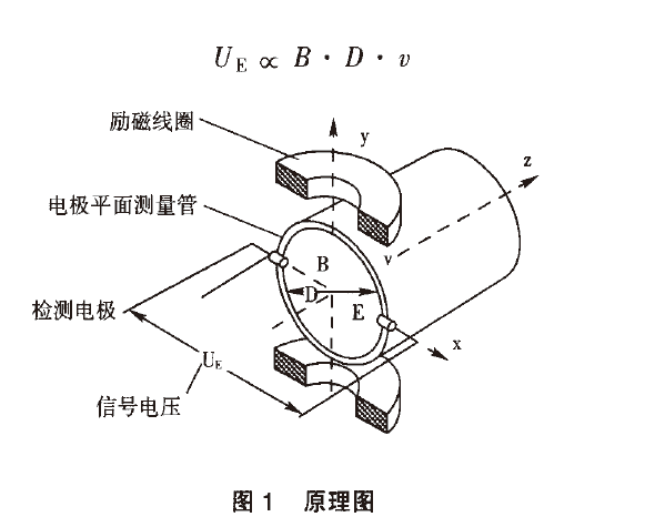 電廠污水處理流量計的基本原理是以法拉*電磁感應定律為基礎,即導體在磁場中作切割磁力線運動時,在其兩端產生感應電動勢。該原理用于測量管道內流動的導電性流體。導電性液體在垂直于磁場的非磁性測量管道內流動,并且流體流動的方向與磁場方向相垂直(見圖1),