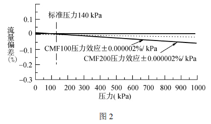 從圖2 中, 我們可以看出壓力對(duì)測(cè)量準(zhǔn)確度的影響:當(dāng)工藝壓力增大, 會(huì)使流量計(jì)產(chǎn)生一個(gè)負(fù)向偏差, 表現(xiàn)為流量顯示值比實(shí)際值偏小;當(dāng)壓力減小時(shí), 會(huì)使流量計(jì)產(chǎn)生一個(gè)正向偏差, 表現(xiàn)為流量顯示值比實(shí)際值偏大。