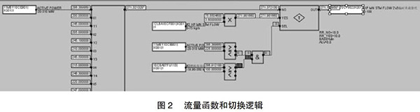 但是由于近期趨勢可能收集不到部分負荷段的相關(guān)數(shù)據(jù),在超出現(xiàn)有數(shù)據(jù)負荷的部分應采取必要的補救措施,可以參考相同負荷運行的另一臺余熱鍋爐的主蒸汽流量,以此來彌補現(xiàn)有數(shù)據(jù)的不足。為了保證數(shù)據(jù)切換的可靠性,切換條件要嚴謹,現(xiàn)有函數(shù)的負荷下線上增加25MW與另外一臺的燃機負荷大于100MW。如此設(shè)置的好處是當另一臺運行機組突然故障或跳機時保證數(shù)據(jù)能及時切換到函數(shù)輸出,保證機組的安全運行。具體操作見圖2。