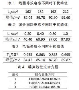 仿真試驗中,設定線圈等效電感取值范圍為 162~212mH,間隔 10mH;閉合回路等效電感范圍 0.2~1mH,間隔為 0.2mH;雙電層電容、接觸電阻隨流體電導率變化而變化,電導率增大接觸電阻和雙電層電容減小而電荷傳遞電阻增大??稍O定電*接觸電阻、雙電層電容和電荷傳遞電阻范圍分別為 5~15kΩ、10~20μF 和50~60Ω,由公式(7)知,可用 T2 表示上述三者關系。 仿真參數(shù)取值不同情況下,通過 MATLAB 工具箱對仿真測量得到的干擾峰值進行曲線擬合畫出相應的曲線圖。 其中仿真數(shù)據(jù)和相對應的曲線方程如表 1~表 4 所示,曲線圖如圖 4~圖 6。