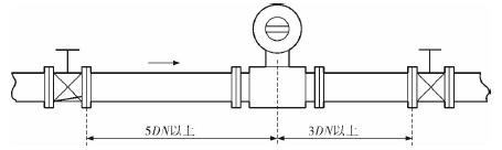 管道熱水流量計的安裝質(zhì)量對其測量結(jié)果的影響較大,因此在安裝時需要注意幾個問題。*先,管道熱水流量計直管段的選擇在配管時一定要按照要求進行選擇,一般選擇流量計通徑與工藝管道通徑相同,即可滿足工程需要,而且安裝方便、壓力損失小,流量計直管段上游側(cè)的長度不少于5倍工藝管道直徑,下游側(cè)的長度不少于3倍工藝管道直徑(圖2)。但在流速太慢而又要求精度較高或需要變徑的應(yīng)用場合,可選擇通徑小于工藝管道通徑的流量計,以提高測量精度,此時流量計上、下游必須加裝異徑管,且進口異徑管上游側(cè)應(yīng)有長于10倍工藝管道直徑的直管段,下游側(cè)應(yīng)有長于5倍工藝管道直徑的直管段(圖3)。