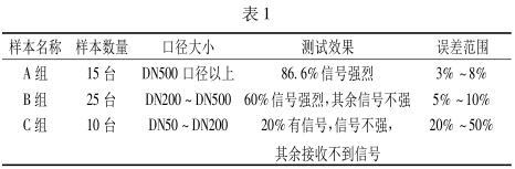 通過大量的在線檢測試驗(yàn),可以看出所測管道管徑對超聲流量計測試效果有明顯影響。根據(jù)數(shù)據(jù)顯示,管徑越大,測試效果越好,示值誤差越小。隨著管徑的減小,超聲流量計所能檢測到的流速信號也隨著變?nèi)?,?dāng)口徑小于 DN50 時,基本沒有信號或是產(chǎn)生巨大的干擾信號。