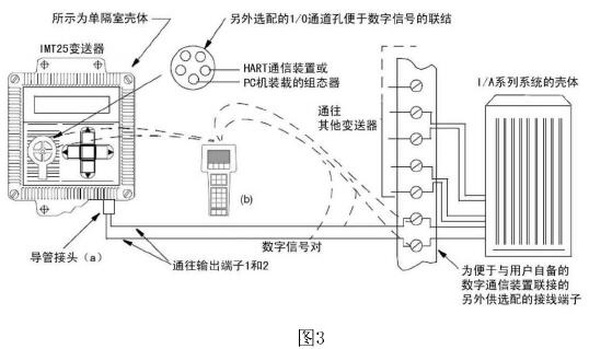 HART通信裝置或裝載在PC機上的組態(tài)器可以連接在變送器現(xiàn)場接線端到外部負(fù)載之間的任何位置,或連接到另外配供的1/0孔口上。如圖3所示: