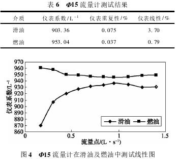 依據(jù)表5測試數(shù)據(jù),經(jīng)計(jì)算可得,Φ15流量計(jì)在滑油及燃油中測試結(jié)果如表6所示,測試線性圖如圖4所示。