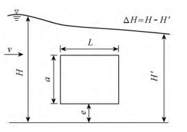 有限水域的浮體結(jié)構(gòu)在不同來(lái)流動(dòng)水中運(yùn)行時(shí),浮體結(jié)構(gòu)位置的改變會(huì)對(duì)流場(chǎng)產(chǎn)生影響,從而影響浮體結(jié)構(gòu)的泄流能力以及穩(wěn)定性。試驗(yàn)過程中固定浮體結(jié)構(gòu)的體型不變(長(zhǎng)L=0.20m,寬B=0.30m,高a=0.10m),分別選取4種不同來(lái)流流量Q及浮體結(jié)構(gòu)位置e,控制浮體結(jié)構(gòu)在上、下游水位不變的條件下進(jìn)行試驗(yàn),具體試驗(yàn)參數(shù)設(shè)計(jì)及說明見表1以及圖2。