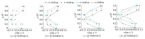 圖4橫坐標(biāo)為斷面水流方向流速,縱坐標(biāo)為測(cè)點(diǎn)垂向位置與下游水位的比值y/H'。隨著浮體結(jié)構(gòu)位置的上升,*小斷面流速位置同樣上升。以圖3(a)為例,當(dāng)e=0.02m時(shí),下游斷面位置自下而上呈現(xiàn)先減小、后增大的趨勢(shì),在y/H'=0.40時(shí)流速達(dá)到*小,隨著浮體結(jié)構(gòu)位置的上升,*小流速呈現(xiàn)向上偏移的趨勢(shì)。在斷面位置y/H'=0.20時(shí),隨著e的增大,流速呈現(xiàn)增大的趨勢(shì)。當(dāng)e較小時(shí),流經(jīng)浮體結(jié)構(gòu)下部進(jìn)行下泄的水流較少,主流出現(xiàn)在浮體結(jié)構(gòu)的上部,且在浮體結(jié)構(gòu)的阻擋作用下出現(xiàn)回流區(qū);隨著e上升,主流偏向浮體結(jié)構(gòu)下部區(qū)域,流速增大。與y/H'=0.20的流速分布正好相反,當(dāng)y/H'=0.80時(shí),流速分布隨著浮體位置的增大而減小。隨著e的增大,通過浮體結(jié)構(gòu)下部泄流的水體增多,主流開始向下偏移。試驗(yàn)過程中,浮體結(jié)構(gòu)處于淹沒狀態(tài),流速的分布隨著浮體位置的改變呈現(xiàn)上大、中小、下大的分布趨勢(shì),在浮體結(jié)構(gòu)下游區(qū)域形成回流區(qū),回流區(qū)的位置隨著浮體結(jié)構(gòu)的上升而上升。