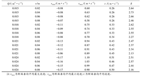 流速沿?cái)嗝娣植嫉木鶆蛱匦钥梢酝ㄟ^流速分布不均勻系數(shù)進(jìn)行表征,通過所選取斷面*大流速和*小流速的差值與該斷面平均流速的比值,δ值越大表明浮體結(jié)構(gòu)的存在對(duì)水流斷面流速的分布產(chǎn)生的影響較大。表2中,當(dāng)來(lái)流流量相同時(shí),流速的不均勻系數(shù)多數(shù)隨e的增大而減小。浮體結(jié)構(gòu)位置較小時(shí),主流為浮體結(jié)構(gòu)上部的水流。隨著浮體結(jié)構(gòu)位置的上升,來(lái)自上游的水體逐漸分成浮體結(jié)構(gòu)上部和下部的兩股主流,流速分布的不均性減小。浮體結(jié)構(gòu)位置及所處水位條件相同時(shí),來(lái)流流量的增大,區(qū)域的平均流速增大,因此流速不均勻性減小。