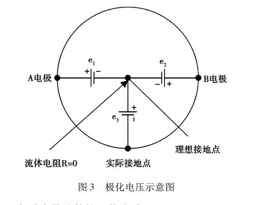 在被測液體與電*和接液部件接觸過程中,電解質(zhì)中的正負(fù)離子會分別作定向運動,這會使被測液體在電*和接液部件之間形成電位差,通常將這種現(xiàn)象稱為*化現(xiàn)象。如圖3 所示,理論上來說,兩電*A 和B 對接液部件的電位e1、e2大小相等、方向相反,此時兩電*的電位差等于零。但是,若兩電*的材質(zhì)或表面狀態(tài)存在差異,此時A、B 電*之間的電位差就不為零,這就形成了*化電壓,*化電壓與共模狀態(tài)的電壓e3一起疊加在流量信號中,被輸入轉(zhuǎn)換器的差動放大器。當(dāng)*化電壓過大,則會對差動放大器的輸入端造成較大影響,導(dǎo)致信號無法放大或流量信號的輸出波動過大,從而降低了衛(wèi)生型卡箍電磁流量計的測量精度。