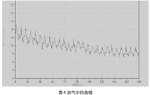 圖4、圖5中所示曲線(xiàn)為測(cè)量過(guò)程中所截取的集流傘中所聚集的氣相,通過(guò)排氣通道排出時(shí)與排出后的測(cè)量曲線(xiàn)。測(cè)試過(guò)程中錄取到的儀器排氣的過(guò)程,當(dāng)集流傘完全支開(kāi)后仍需要開(kāi)啟流量測(cè)試進(jìn)行實(shí)時(shí)檢測(cè),否則可能會(huì)錄取資料失真。