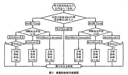 實(shí)際生產(chǎn)中流量一直在某個(gè)區(qū)域內(nèi)波動(dòng),且其動(dòng)態(tài)特性不易掌握。從上面的理論中我們能夠讓誤差△£盡可能的小,這樣距我們所需要的理論值%就越接近。而減小誤差需要我們把n取的盡可能大,也就是在生產(chǎn)時(shí)間內(nèi)劃分更多的周期去調(diào)節(jié)流量。當(dāng)工控機(jī)根據(jù)測(cè)濃硫酸流量計(jì)傳送回來的信號(hào)發(fā)出調(diào)節(jié)變頻器工作頻率的指令后,電機(jī)調(diào)整功率到測(cè)濃硫酸流量計(jì)的實(shí)際測(cè)量為一個(gè)工作周期,我們知道從指令發(fā)送到實(shí)際測(cè)量值返回有一個(gè)較大的滯后,如果調(diào)節(jié)的周期時(shí)間小于流量計(jì)本身的一個(gè)工作周期,那么顯然不可能達(dá)到減小誤差的目的。利用模糊控制思想H。,在控制程序中我們把流量的波動(dòng)區(qū)域劃分為±缸×Yo,Yo-t-O.3,Yo±0.5四個(gè)區(qū)域,其中缸為可調(diào)節(jié)的誤差范圍,生產(chǎn)中我們?nèi)?.015,流量區(qū)域劃分的單位均為t/h。針對(duì)不同的區(qū)域采取不同的調(diào)整方案。具體流程如圖3所示。圖中變量Rel表示實(shí)際測(cè)量的流量,變量Idea表示理論流量。