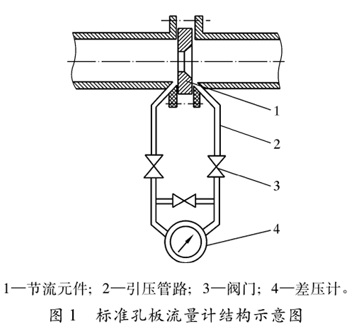標準管道空氣流量計結構如圖1所示,包括節(jié)流元件(標準孔板及其取壓裝置)、傳輸壓差信號的引壓管路、閥門以及差壓計等部分。標準孔板是壓差測量時的一次元件,人們利用它在管道內(nèi)使流體產(chǎn)生壓差,再通過引壓管路把孔板前、后產(chǎn)生的壓差傳送給差壓變送器,再輸人到二次儀表,從而顯示出管道內(nèi)流體的靜壓、壓差、瞬時流量和累計流量等計量參數(shù)。