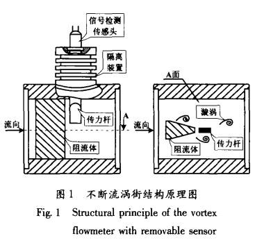 不斷流渦街同樣是以卡門渦街原理為依據(jù)測量流體流速的,但不斷流渦街表體已經(jīng)在結(jié)構(gòu)上有了質(zhì)的改變。如圖1所示,它將普通渦街單一的信號檢測傳感頭改變?yōu)閭髁U與信號檢測傳感頭兩部分,并通過隔離裝置完全隔離。當(dāng)表體中流過流體并產(chǎn)生漩渦時,由傳力桿檢測漩渦的變化,并以力的形式傳遞給信號檢測傳感頭,完成了力信號到電信號的轉(zhuǎn)換過程。雖然傳力桿與流體直接接觸,但其本身只是進行力傳輸?shù)母軛U,因此,只對外形尺寸及鋼材選擇上具有要求。而信號檢測傳感頭是通過隔離裝置與流體完全密閉隔離的,再加上隔離裝置本身具有的散熱功能,使得信號檢測傳感頭的使用溫度要遠遠低于流體的實際溫度,從而有效地提高了普通信號檢測傳感頭的可測介質(zhì)溫度。同時,不斷流渦街在進行維修更換信號檢測傳感頭時,并不影響工藝管道內(nèi)流體的流動,真正實現(xiàn)了信號檢測傳感頭的不斷流拆裝維護。