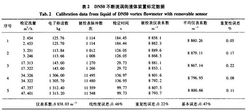 分別用精度0.5級音速噴嘴氣體標(biāo)定裝置、精度0.2級稱重法水標(biāo)定裝置對DN50口徑的不斷流渦街進行實際標(biāo)定,其標(biāo)定數(shù)據(jù)如表1、表2所示。