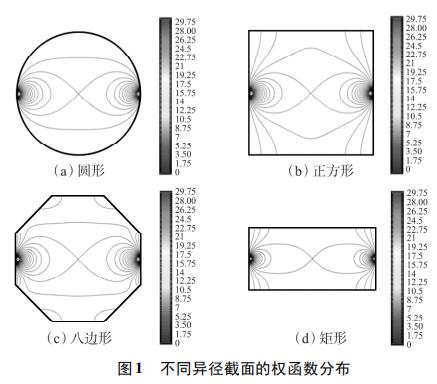 為考察不同異徑截面權(quán)函數(shù)分布的均勻性,使用上述方法對(duì)圓形、正方形、八邊形和矩形異徑截面的權(quán)函數(shù)分布進(jìn)行定性分析。為了便于對(duì)比,設(shè)置管道口徑為DN100,異徑部分截面積為3200mm2。所以,圓形異徑面半徑為32mm,正方形異徑面邊長(zhǎng)為56.6mm,八邊形異徑面邊長(zhǎng)為25.8mm,矩形異徑面長(zhǎng)寬為80×40mm。仿真結(jié)果如圖1所示,為了便于對(duì)比,權(quán)函數(shù)等勢(shì)線大小從0開(kāi)始,以0.25為步長(zhǎng)遞增到30。由圖1(a)~圖1(d)可知,矩形異徑截面的權(quán)函數(shù)等勢(shì)線間距*大,即權(quán)函數(shù)變化梯度*小,權(quán)函數(shù)分布*均勻。