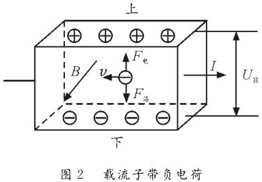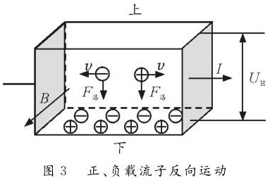 反之,如圖2所示,若載流子帶負(fù)電荷,則載流子在洛倫茲力作用下會(huì)向下偏轉(zhuǎn),導(dǎo)體下表面積累負(fù)電荷。同時(shí),上表面失去負(fù)電荷而帶上正電,從而使上表面電勢(shì)高于下表面。