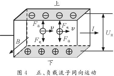 情形2:正、負(fù)載流子反向運(yùn)動(dòng)。如圖3所示,長方體玻璃水槽中盛有NaCl的水溶液,水槽左、右側(cè)壁內(nèi)側(cè)各裝一導(dǎo)體片,在溶液中通入水平向右的電流,勻強(qiáng)磁場B垂直紙面向外。NaCl溶液中既有正離子,又有負(fù)離子,根據(jù)左手定則可判斷正離子受到向下的洛倫茲力,故向下運(yùn)動(dòng)并堆積。同理,負(fù)離子也受到指向下的洛倫茲力,也向下運(yùn)動(dòng)并堆積。由于正負(fù)離子均向下側(cè)面堆積,故上下兩側(cè)面的電勢(shì)均為零,但下側(cè)面處離子濃度大于上側(cè)面離子濃度。