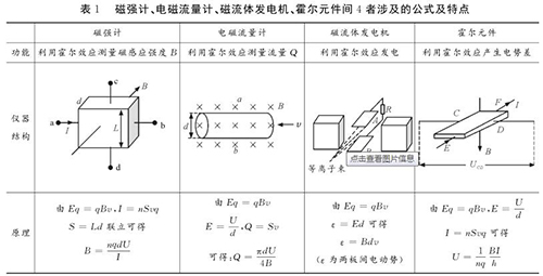 易錯(cuò)點(diǎn)2:磁強(qiáng)計(jì)、印染污水流量計(jì)、磁流體發(fā)電機(jī)、霍爾元件間的區(qū)別與聯(lián)系磁強(qiáng)計(jì)、印染污水流量計(jì)、磁流體發(fā)電機(jī)、霍爾元件都是利用電磁場對(duì)帶電粒子的偏轉(zhuǎn)效應(yīng),并且穩(wěn)定時(shí)電場力與磁場力均達(dá)到平衡。很多學(xué)生容易將其混淆,遇到問題常常搞不清原理,亂代公式,筆者特將4者涉及的公式及特點(diǎn)等做一對(duì)比區(qū)別如表1所示。