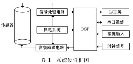 高頻勵磁防腐型電磁流量計由傳感器、高頻勵磁電路、信號處理電路等組成,其中高頻勵磁電路決定著傳感器磁場的強(qiáng)弱,勵磁電路的穩(wěn)定性以及精確性決定著系統(tǒng)檢測的準(zhǔn)確性以及穩(wěn)定性。DSP 系統(tǒng)控制勵磁電路激勵傳感器線圈,當(dāng)線圈中有導(dǎo)電液體流過時,其切割磁感線并在傳感器兩端的線圈上產(chǎn)生感應(yīng)電動勢,利用信號檢測電路監(jiān)測感應(yīng)電動勢的大小,*后根據(jù)相應(yīng)關(guān)系計算出液體的流量,系統(tǒng)硬件框圖如圖 1 所示。