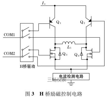 由圖 3 可知,I o 為高低壓切換恒流控制電路輸出的恒流源電流,H 橋驅(qū)動的 COM1 端控制三*管 Q 1和場效應(yīng)管 Q 4 的通斷;COM2 端控制三*管 Q 2 和場效應(yīng)管 Q 3 的通斷。L 1 表示的是勵磁線圈(傳感器中線圈),COM1、COM2 為正交的 PWM 波信號,因此在勵磁線圈 L 1 的兩端會產(chǎn)生方波勵磁信號。檢流電路主要是用來檢測勵磁線圈中電流的變化,當(dāng)線圈中的勵磁電流方向變化時,可以及時將此信息反饋給高低壓切換恒流控制電路中的比較器,從而實(shí)現(xiàn)切換高低壓源達(dá)到恒流控制的目的。