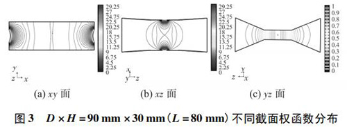 2) 圖 4( a) 、圖 5( a) 的 xy 面權函數(shù)分布表明,H = 30 mm時中心區(qū)域的權函數(shù)等勢線間距較大,且中心區(qū)域的權函數(shù)等勢線逐漸變?yōu)橹本€; 電*附近的權函數(shù)等勢線比較稀疏,且等勢線顏色較淺,權函數(shù)*大值較小,變化梯度小,因 此,H = 30 mm 時 xy 面的權函數(shù)分布更加均勻。