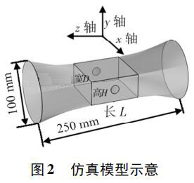 使用 Pro /E 軟件建立三維幾何模型,導入 COMSOL 軟件進行有限元求解。仿真模型如圖 2 所示,電*連線為x 軸,連線中點為坐標原點,流體運動方向為 z 軸,傳感器管道口徑為 DN100,總長250 mm。異徑管部分初始結構尺寸 L = 80 mm,D = 80 mm,H = 40 mm,圓形電*半徑為17 mm,伸出絕緣襯里的*大距離為 1. 5 mm。