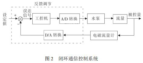通信控制系統(tǒng)由工控機、變頻器、水泵、數(shù)據(jù)采集卡、煤油流量計等組成。在整個熱量表耐久性試驗裝置中,煤油流量計與被試驗熱量表串聯(lián)在試驗管路中。系統(tǒng)設(shè)定流量值 qs,通過工控機發(fā)送信號給變頻器,來控制水泵運轉(zhuǎn),系統(tǒng)通過研華數(shù)據(jù)采集卡 PCI1711 將采集到的煤油流量計當(dāng)前瞬時流量值反饋給工控機,工控機將返回流量值與設(shè)定流量值qs進行比較,從而確定是否需要重新調(diào)整變頻器頻率控制水泵轉(zhuǎn)速。此過程是一個完整的閉環(huán) PID 控制過程,其閉環(huán)控制過程如圖 2 所示。 2. 2 管路切換系統(tǒng)管路切換主要由冷熱水箱、水泵、開關(guān)閥等組成。要實現(xiàn)熱量表耐久性 4000 次冷熱沖擊試驗,需要實時控制管路中熱水與冷水的交替使用。
