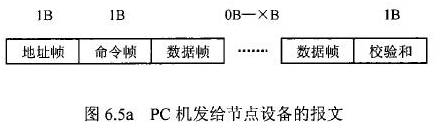 在花生油流量計(jì)等節(jié)點(diǎn)設(shè)備和C機(jī)通信的過程中,由地址幀、命令幀、數(shù)據(jù)幀、校驗(yàn)和可組成各種功能不同的報(bào)文。由于采用主從工作方式來實(shí)現(xiàn)通信,花生油流量計(jì)等節(jié)點(diǎn)設(shè)備僅能接收并執(zhí)行PC機(jī)發(fā)送來的控制命令,而不能發(fā)送命令給PC機(jī)。因此,由PC機(jī)發(fā)往流量計(jì)等節(jié)點(diǎn)設(shè)備的報(bào)文一般包括一個(gè)地址幀,一個(gè)命令幀,若干個(gè)數(shù)據(jù)幀和一個(gè)校驗(yàn)和,其報(bào)文格式圖.6a5所示;而由流量計(jì)等節(jié)點(diǎn)設(shè)備發(fā)往PC機(jī)的報(bào)文一般包括一個(gè)地址幀,若干個(gè)數(shù)據(jù)幀和一個(gè)校驗(yàn)和,其報(bào)文格式如圖6.5b所示。