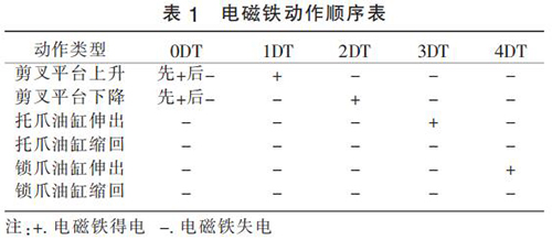 改進(jìn)后液壓系統(tǒng)工作原理:通過溢流閥調(diào)整剪叉油缸工況所需壓力,通過疊加溢流閥來調(diào)整托爪和鎖爪工況所需壓力。 剪叉平臺上升(剪叉油缸縮回)或下降(剪叉油缸伸出)時 0DT 先得電,當(dāng)剪叉油缸到位后 0DT 失電,大泵供油無壓流回油箱。 通過電磁換向閥 17(1DT 和 2DT 的得失電)來控制剪叉油缸的伸出或縮回,通過電磁換向閥 18(3DT 和4DT 的得失電)來控制托爪和鎖爪的伸出和縮回。改進(jìn)后液壓系統(tǒng)的電磁鐵動作順序如表 1 所示。