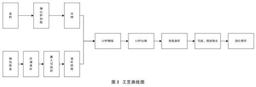1.1 偏心爐+LF 爐雙聯(lián)冶煉工藝,鋼包冷調(diào)、熱裝燃?xì)饬髁坑?jì)工藝路線圖簡(jiǎn)介如圖 1。