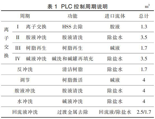 APU 的運行按照事先設(shè)定的程序運行,即嚴格遵循設(shè)定的步驟順序。 APU 的正確運行依賴于每個步驟的順利完成。 按照預(yù)先設(shè)定好的步驟完成 1 個任務(wù)即視為完成 1 個 APU 運行的“周期”。 離子交換的主周期被稱為“離子交換周期”。除此之外,整個控制程序還包含另外 5 個輔助周期, 分別為反沖洗周期、調(diào)節(jié)周期、胺液沖洗周期、水沖洗周期、回流液沖洗周期。 這 5 個周期在維護和非計劃停車后重新啟動時使用。 PLC 控制各個周期的說明見表 1。