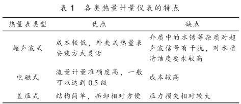 目前供熱行業(yè)內(nèi)使用的熱量計(jì)量?jī)x表按工作原理主要分為超聲波式、 電磁式、 差壓式, 其特點(diǎn)見(jiàn)表 1 。 熱量計(jì)量?jī)x表按結(jié)構(gòu)可分為一體式和分體式, 一體式熱量表將一支入口或出口溫度傳感器嵌入到流量傳感器管道中, 并配有專(zhuān)門(mén)的計(jì)算器進(jìn)行熱量計(jì)算; 分體式熱量表采用單獨(dú)的流量傳感器, 包括超聲波流量計(jì)、 電磁流量計(jì)、 差壓流量計(jì)、飽和鹽水流量計(jì)等, 溫度測(cè)量采用單獨(dú)的鉑電阻溫度計(jì)或溫度變送器測(cè)量供回水管道溫度, 再配備熱量積算儀進(jìn)行溫度和流量信號(hào)采集得到熱量值。