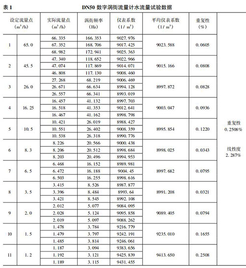 將本文實現(xiàn)的數(shù)字煙氣流量計在上述 50mm 口 徑( 簡稱 DN50) 的水流量試驗裝置上進行試驗。先在其正常流量范圍內進行試驗,流量從大到小逐漸降低,之后不斷探求其所能測量的*小流量。每個流量點試驗三次,計算其重復性、平均儀表系數(shù)和線性度。水流量試驗數(shù)據(jù)如表 1 所示。