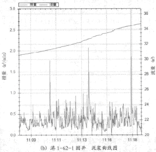 在固井全程的曲線中,也可以發(fā)現(xiàn)開始固井的時候.泥漿排量雜波較小,究其原因是剛開始固并時,泥漿管線剛泄壓,管線中還是充滿了液體,雖然振動強度雷同.但是葉片有阻尼,振幅較小.對其影響也較小。例如曲線圖的11;03: 00-11: 03: 53之間的泥漿排量沒有雜波。在港1-62-1固井過程中,水泥漿打了413澎,結(jié)果本應(yīng)該是0的泥漿,卻走數(shù)了23.0 m',其影響可謂巨大.并非通過普通的濾波或切除所能排除,必須執(zhí)行一個特殊算法。