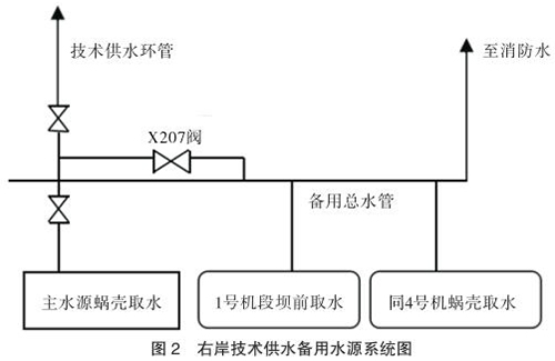 技術(shù)供水系統(tǒng)設有主、備用水源。主水源是蝸殼取水,作為機組技術(shù)供水的主用水源。備用水源有兩個,一個是設在 1 號機段的壩前取水,取水口高程為 145m,另一個是同 4 號機組蝸殼取水共用取水口的蝸殼備用取水。兩路備用水源均接到備用總水管,并通過 X207 閥分別與各臺機組的技術(shù)供水系統(tǒng)相連通(見圖 2)。