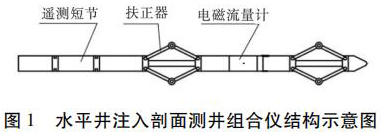 水平井注入剖面測井組合儀是針對水平井籠統(tǒng)注水井注入剖面測井專門研制的,儀器結(jié)構如圖 1 所示。井下儀器主要包括通用短節(jié)( 遙測、溫度、壓力和 CCL) 、硫酸銅流量計和滾輪式扶正器。測量參數(shù)包括流量、溫 度、壓力、自然伽馬和深度。流量計采用的是非集流硫酸銅流量計和集流型硫酸銅流量計,對于注入量較大的井采用非集流硫酸銅流量計,注入量較小的井采用集流型硫酸銅流量計,測量方式采用定點測量。儀器采用遙測技術實現(xiàn)了多參數(shù)同時測量和傳輸,儀器外徑 38 mm,耐壓80 MPa,耐溫150 ℃,流量測量范圍為1 ~ 800 m3 /d,測量精度 ± 5% 。