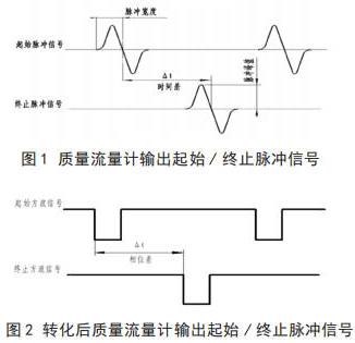 將高壓電磁流量計(jì)流量與相關(guān)測試設(shè)備連接起來,就可以進(jìn)行高壓電磁流量計(jì)的校準(zhǔn),時(shí)間差△ t 由專用試驗(yàn)測試設(shè)備可以測出。起始脈沖信號和終止脈沖信號如圖 1 所示。經(jīng)過專用試驗(yàn)測試設(shè)備信號轉(zhuǎn)化后的信號方波如圖 2 所示。