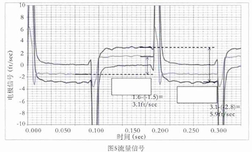舉例,如圖5所示,線圈采用5Hz驅(qū)動時(shí)的0feet/s,3.1feet/s,5.9feet/s流速下的電*信號,利用上述方法對信號進(jìn)行處理并計(jì)算流速。取每半波*后的20%納入流速計(jì)算,正半波與負(fù)半波相減即是流速。如3.1feet/s–(-2.8feet/s)=5.9feet/s,雖然有+0.15 feet/s的直流偏置,但也不影響流速的計(jì)算。因線圈是5Hz驅(qū)動,半波的20%是20ms,正好是1個(gè)完整的工頻周期,這樣就不受工頻干擾的影響。正半波與負(fù)半波相減,這樣就避免了直流偏置和共模干擾的影響。再加上在數(shù)字濾波過程中使用限幅濾波和算數(shù)平均,保證了流量信號的有效提取。