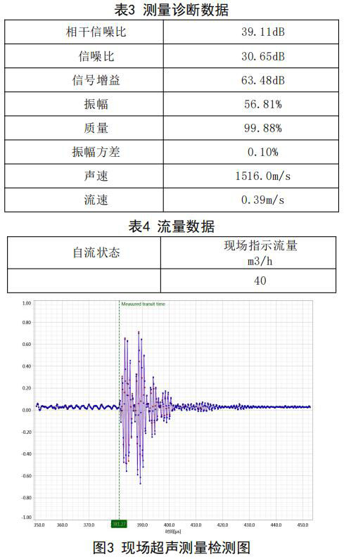 在高負(fù)荷段采用泵送補(bǔ)給水狀態(tài):測試時(shí)間 2018年10月11日,采用德國FLUEX高精度外夾式超 聲波流量計(jì)作為標(biāo)準(zhǔn)流量計(jì),測量基礎(chǔ)數(shù)據(jù):管道 外徑276.93mm,管壁厚度12.40mm,采用兩聲程169mm傳感器安裝距離,通過對超聲波流量計(jì)信號 分析與診斷(數(shù)據(jù)見表1、表2和圖2),診斷數(shù)據(jù) 提示標(biāo)準(zhǔn)超聲波流量計(jì)測量狀況佳,檢測開始,啟 動補(bǔ)給水泵,運(yùn)行一段時(shí)間流量穩(wěn)定后,測量結(jié)果 如下: