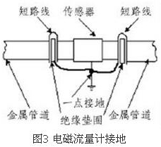 (4)盡量避開(kāi)振動(dòng)源、磁源(大功率電機(jī)、變壓器)由于智能渦輪流量計(jì)的測(cè)量感應(yīng)電壓很小,電壓較低,易受外界電磁噪聲的影響,故在安裝時(shí)應(yīng)進(jìn)行可靠的接地連(跨)接。金屬管道智能渦輪流量計(jì)接地連(跨)接方法如圖3所示