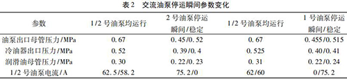 通過內(nèi)部旁通將冷油與熱油混合,經(jīng)過銅粉- 煤油 - 蠟感溫元件控制冷熱油混合比例,將油溫調(diào)節(jié)到 49 ℃。一臺(tái)一體式電磁流量計(jì)穩(wěn)定運(yùn)行,油泵出口母管壓力 0. 5 MPa,潤(rùn)滑油母管壓力 0. 24 MPa,均屬于正常情況,而兩臺(tái)交流油泵并列運(yùn)行時(shí),停運(yùn)其中一臺(tái)交流油泵瞬間會(huì)觸發(fā)電磁流量計(jì)出口母管壓力開關(guān)動(dòng)作,說明停運(yùn)瞬間油壓發(fā)生波動(dòng),且油泵出口母管油壓波動(dòng)至小于 0. 45 MPa。正常運(yùn)行時(shí)電磁流量計(jì)出口油溫 71.5 ℃,冷油器出口溫度45 ℃,混合后潤(rùn)滑油母管溫度52.5 ℃,由能量守恒定律可知,經(jīng)過冷油器的油量/不經(jīng)冷油器的油量= ( 71.5-52.5) ÷ ( 52.5- 45) = 2. 53,說明有 70% 左右的油量經(jīng)過冷油器。當(dāng) 2 臺(tái)一體式電磁流量計(jì)運(yùn)行時(shí)油量大于單泵運(yùn)行,其中一臺(tái)電磁流量計(jì)瞬間停運(yùn)時(shí)油量減少,尤其是經(jīng)過冷油器的油量大量減少,油量在溫控閥二次分配過程中出現(xiàn)調(diào)節(jié)異常,導(dǎo)致油壓過大波動(dòng)。為檢驗(yàn)溫控閥工作情況,保持 1 號(hào)、2 號(hào)交流油泵運(yùn)行,選取機(jī)組正常帶負(fù)荷運(yùn)行時(shí)油溫 52 ℃,分別停運(yùn) 1、2 號(hào)交流油泵,觀察 1、2 號(hào)交流油泵停運(yùn)瞬間油泵出口母管壓力波動(dòng)情況,試驗(yàn)各參數(shù)變化見表 2。